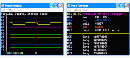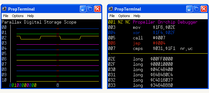 Getestet habe ich die Emulation auch mit "fremden" Anwendungen, wie dem dscope von Parallax, und dem POD von "Kaio". Ich musste jeweils nur im OBJ -Teil des Spincodes das Objekt Keyboard durch PC_Keyboard, und TV_Text oder TV_Terminal durch PC_Text ersetzen. Nachfolgend einige Screenshots: